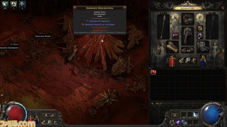 マップ内にはレアのエッセンスが多数あり、レアを倒すごとに中央にあるユニークのエッセンスに報酬が追加されていく。追加するごとにボスが強力になる点に注意が必要だ。また、エッセンスについてはグラフィックが刷新されたほか、ヴァールオーブを使ってコラプト化することが可能となる。そして、ベルトに使用できるインサニティエッセンスなどが追加されている。