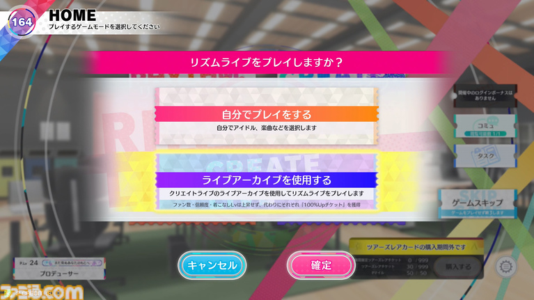 しかし、『ツアマス』の本質はそこだけではない。このゲームにおける“リズムライブ”はアイドルたちの“ライブ”であり、プレイヤーである“プロデューサー”は、出演するアイドルを誰にするか、着る衣装はどうするかなどを細かく設定することが可能となっている。