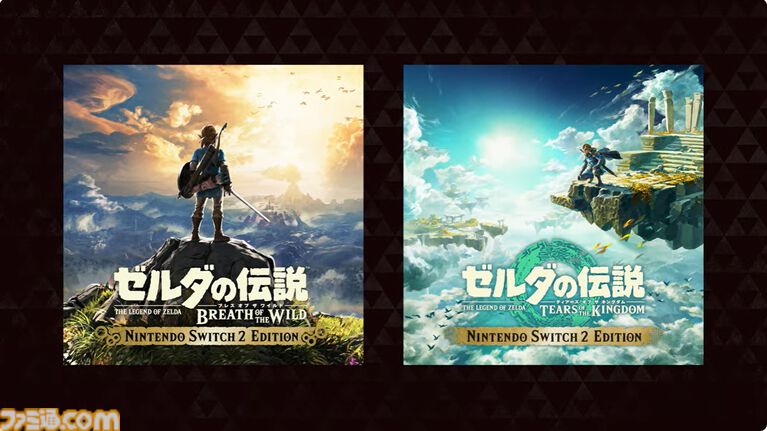 それぞれのタイトルの“Nintendo Switch 2 Edition”は、パッケージ版とダウンロード版が販売されるが、Switch版の所有者は1000円[税込]のアップグレードパスを購入することでプレイ可能。なお、Switch版『ゼルダの伝説 ブレス オブ ザ ワイルド』、『ゼルダの伝説 ティアーズ オブ ザ キングダム』を所有しているかつ、“Nintendo Switch Online + 追加パック”の加入者は追加料金なしで“Nintendo Switch 2 Edition”を利用できるとのこと。