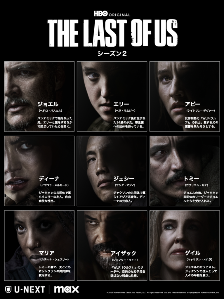 先駆けて『THE LAST OF US シーズン2』字幕版は本日よりU-NEXTにて独占配信開始。本作でエリーを演じるベラ・ラムジーのコメント付きのプロモーション映像と合わせて、ぜひお楽しみください。