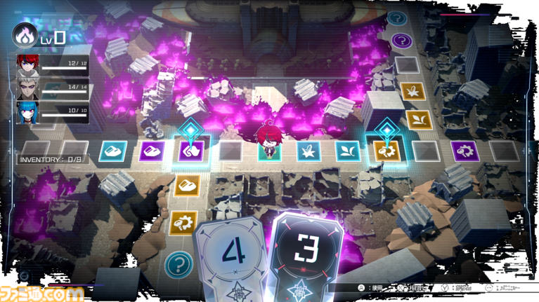 バトルマスでは、侵校生とのバトルが発生。マスの色に応じて、出現する侵校生が強くなっていく。探索中に減ったHPはバトルマスでの戦闘にも引き継がれるため、全体的に仲間のHPが少ない場合はなるべく避けたい。ただし、ストーリー上で発生するバトルでは全員のHPが全回復。とにかく目的地にたどり着けばいいということを覚えておこう。