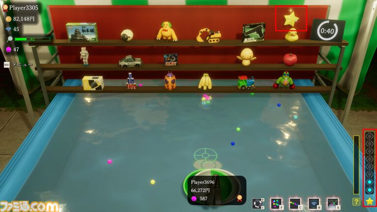 縁日でおなじみの“ボールすくい”と“射的”を組み合わせた作品で、ポイでボールをすくい、撃ち出して景品を狙うというユニークなゲーム性が特徴だ。最大4人でのマルチプレイにも対応しており、イベントやボーナスタイムなど協力プレイで盛り上がれる要素も用意されている。