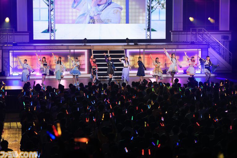 続いては『学マス』のメインテーマであり、初星学園の課題曲である『初』。サビでは多くのプロデューサーが、色とりどりのコンサートライトを手に、左右に腕を大きく振るワイパーで盛り上がる12人全員でピッタリそろえた腕の動きも壮観で、バラバラな衣装も相まって『学マス』の全体曲らしさを感じられるステージになっていた。