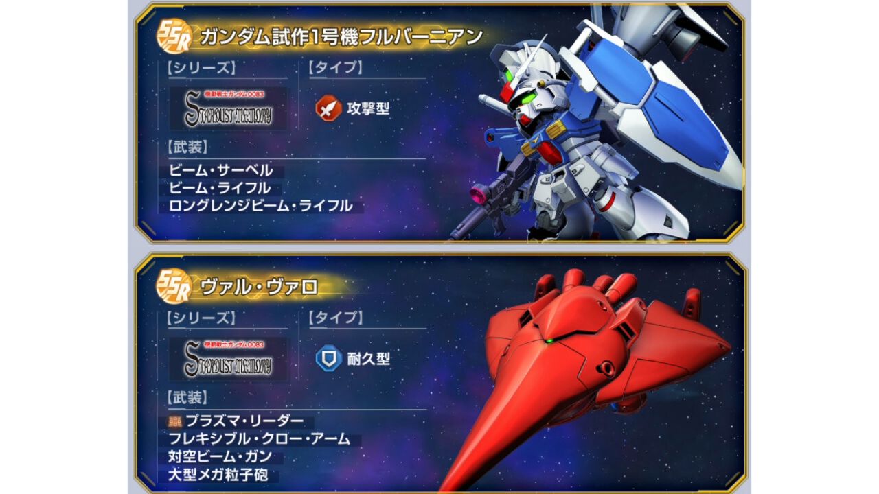 イベント報酬ユニットは、SSRガンダム試作1号機フルバーニアンとSSRヴァル・ヴァロ。新たなパイロットとしてSSRコウ・ウラキとSSRケリィ・レズナーもあわせて登場する。