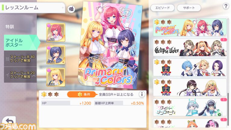アイドル力を底上げする要素としては“アイドルポスター”といったものもあり、こちらはレーベルごとに用意されているポスターの枠に、所持しているアイドルを当てはめることで能力アップを発生させられる。特定のキャラクターを集めて能力アップ、という要素自体は目新しいものではないが、それをポスターというかたちで表現しているのはアイドルものらしさがアップしていておもしろい。