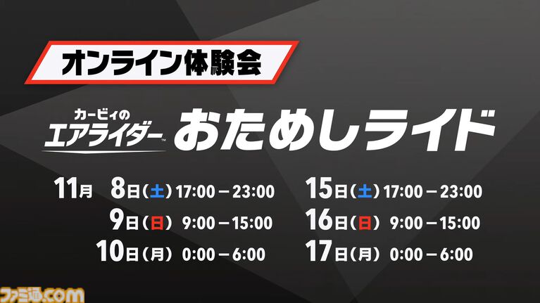 なお、『カービィのエアライダー おためしライド』に参加するには、Nintendo Switch2本体とインターネット接続環境、“Nintendo Switch Online”への加入(有料)が必要となるが、“教習所”および“エアライド”は、Nintendo Switch Onlineに加入していなくても楽しめる。