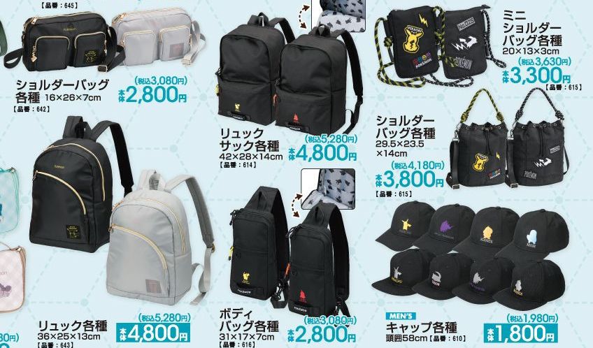 ショルダーバッグやトートバッグ、リュックなどの日常使いしやすいアイテムが多数登場。全面的にかわいいポケモンたちがあしらわれたデザインのアイテムに加え、ワンポイントのシンプルなデザインのアイテムも用意されている。