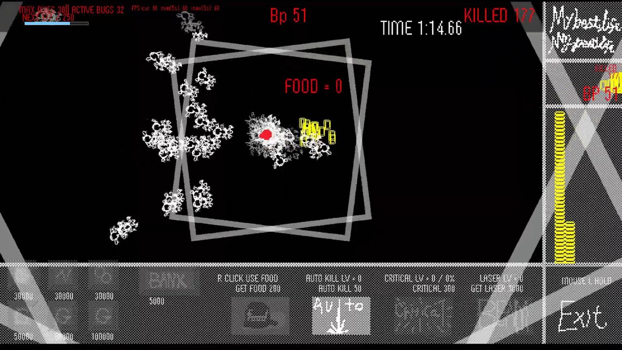 画面に現れる虫を潰してビートを響かせるクリッカーゲーム。虫を潰すことでポイントが溜まり、ポイントを用いて効率よく虫潰しができるようにアップグレードすることができる。楽曲は作者bhaskara氏による2曲、中村修人氏による3曲の計5曲が収録される。