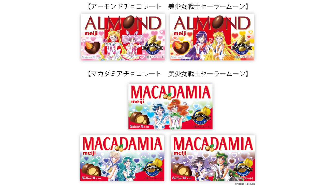 『美少女戦士セーラームーン』のオリジナルパッケージを使用した“アーモンドチョコレート”、“マカダミアチョコレート”、“明治ミルクチョコレートビックパック”の3つの商品は1月20日(火)より発売される。