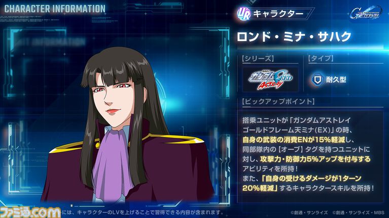 - 搭乗ユニットがガンダムアストレイ ゴールドフレーム天ミナ(EX)の時、自身の武装の消費ENが15%軽減し、同部隊内の【オーブ】タグを持つユニットに対し、攻撃力・防御力5%アップを付与するアビリティを所持
