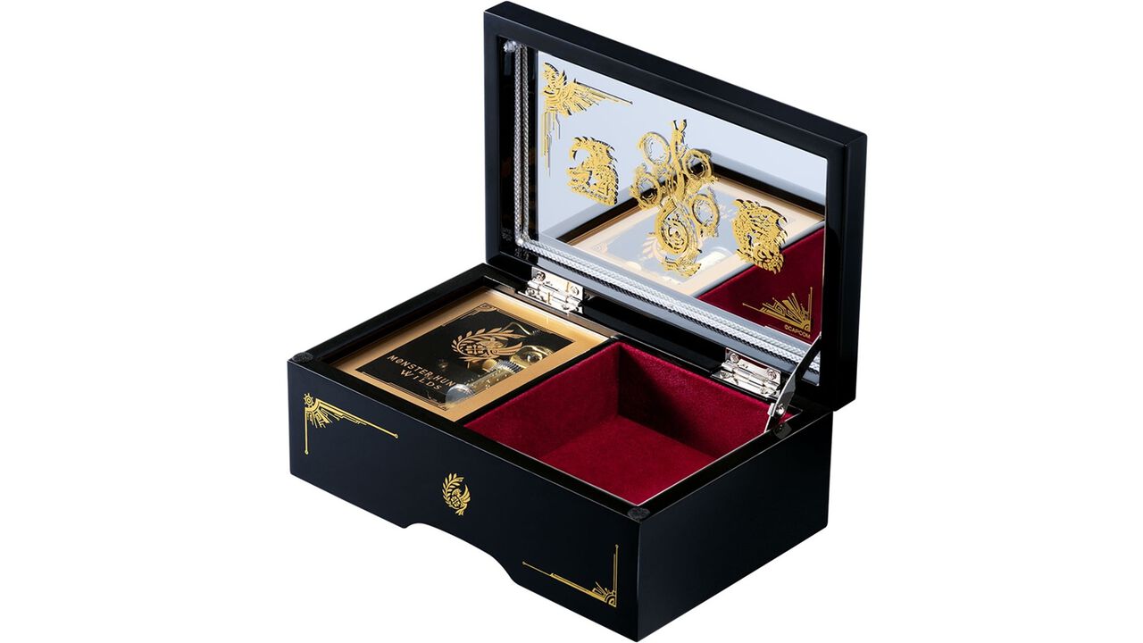 つややかな黒塗りのオルゴールボックスに、金彩蒔絵で施された『モンスターハンターワイルズ』のシンボルマークと、リオレウス&リオレイアの姿。禁足地調査隊のエンブレムや作品の世界観をイメージしたフレームも煌びやかに表現されています。