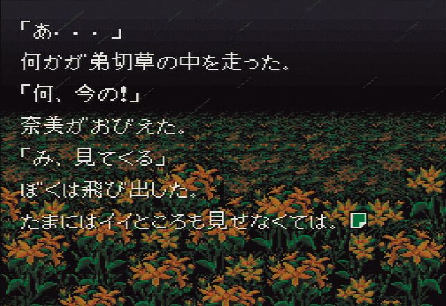 弟切草にまつわる悲劇を軸として話が進むのだが、遊ぶたびに新たな選択肢が現れ、異なる展開へと突入していく。周回を重ねるとちょっとコメディー寄りの選択肢なども追加されておもしろかった。10種類のエンディングを見るとデータ選択画面のしおりがピンク色へと変化。突如としてメタネタ全開のギャグやアダルトな雰囲気の選択肢が増え、思わず吹き出してしまったプレイヤーもいたはず。なお、“ピンクのしおり”は以降の作品でも定番になっており、多くのプレイヤーたちをドキドキさせてくれた。
