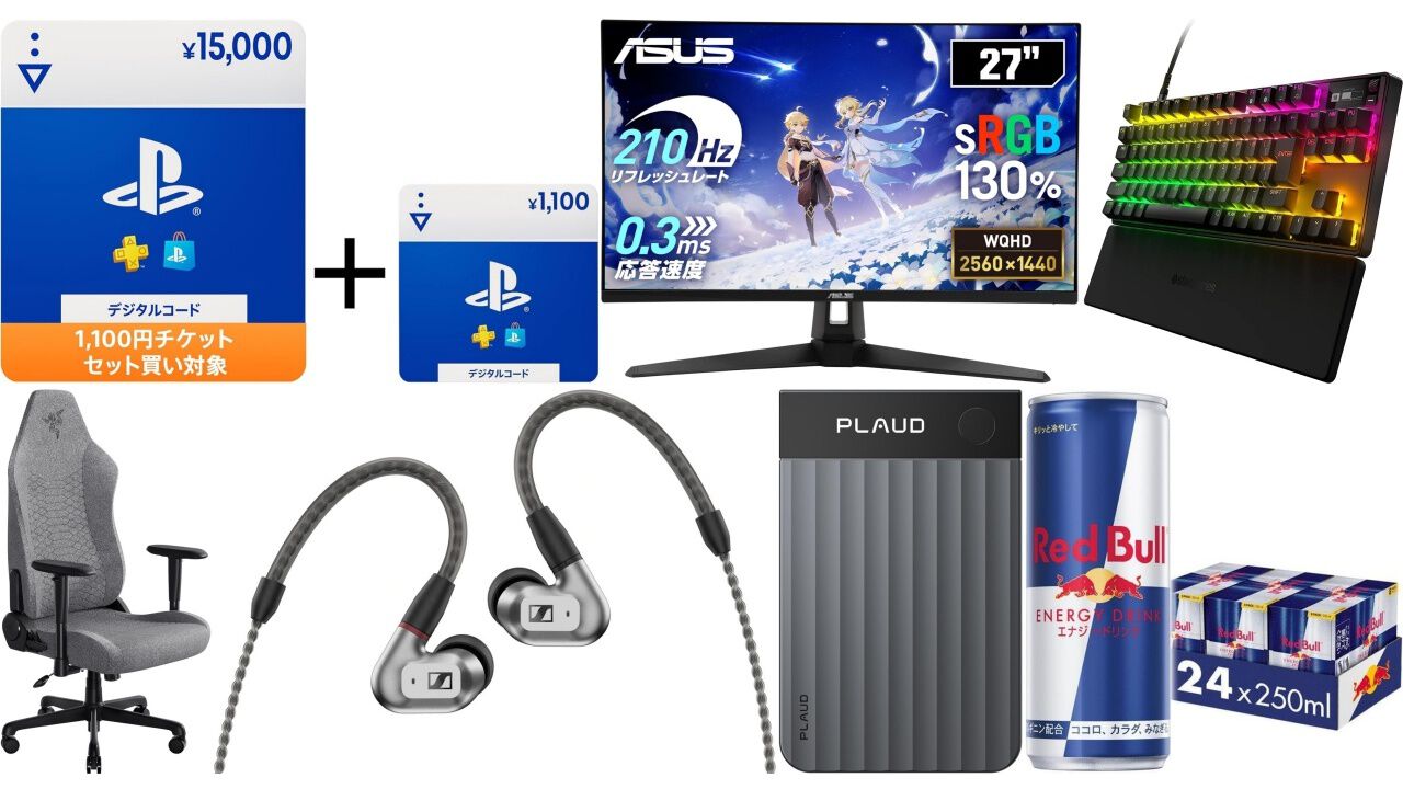 Amazonの“新生活先行セール”が本日2026年3月9日23時59分に終了。本稿ではPSストアチケットの15000円+1100円セットをはじめ、『ゴースト・オブ・ヨウテイ』コレクターズエディション、SteelSeriesのラピッドトリガー搭載ゲーミングキーボード、Razerのゲーミングチェア、ゼンハイザーの有線イヤホン、レッドブルなどまだまだお買い得なセール対象商品を紹介していく。