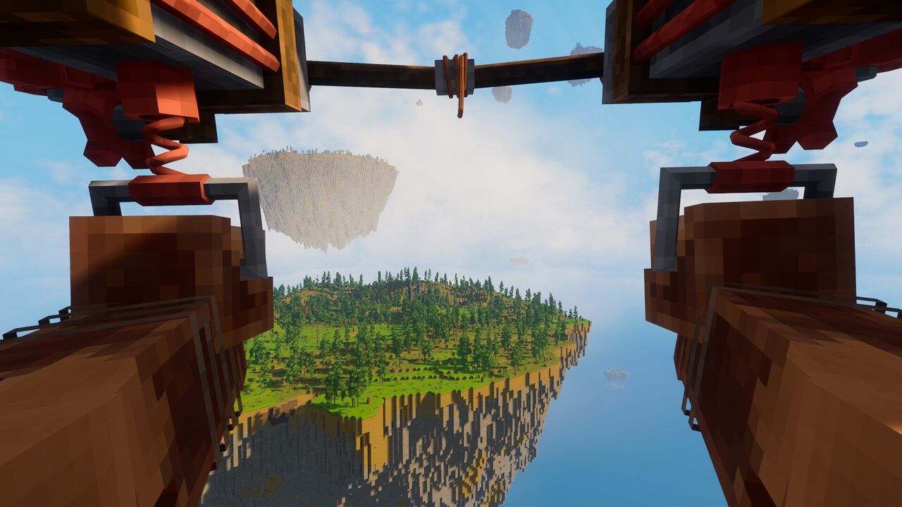 島ではクラフトやダンジョン探索など、サンドボックスゲームらしい目標にとらわれないさまざまな遊びかたが楽しめる。島々を巡って雲のうえへと昇っていくことで、世界の謎が明らかになっていく。