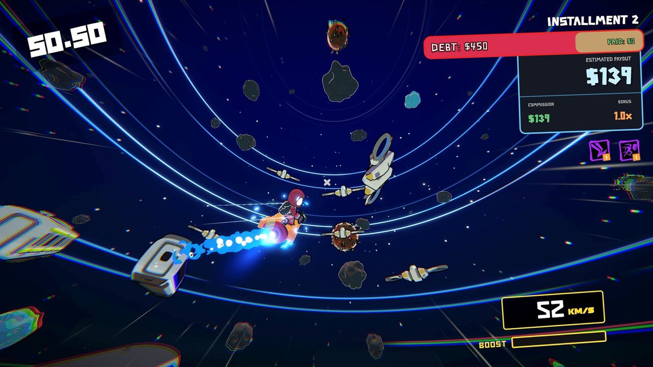ノルマを達成していくとアップグレードが支給され、スピード重視の軽量ホバーボードから一撃重視の重量級ボードなどの新しい装備も獲得することができる。また、宇宙に浮かぶ小惑星の破壊、警察への攻撃などの危険な行動をしていくことが返済のコツとのことだ。