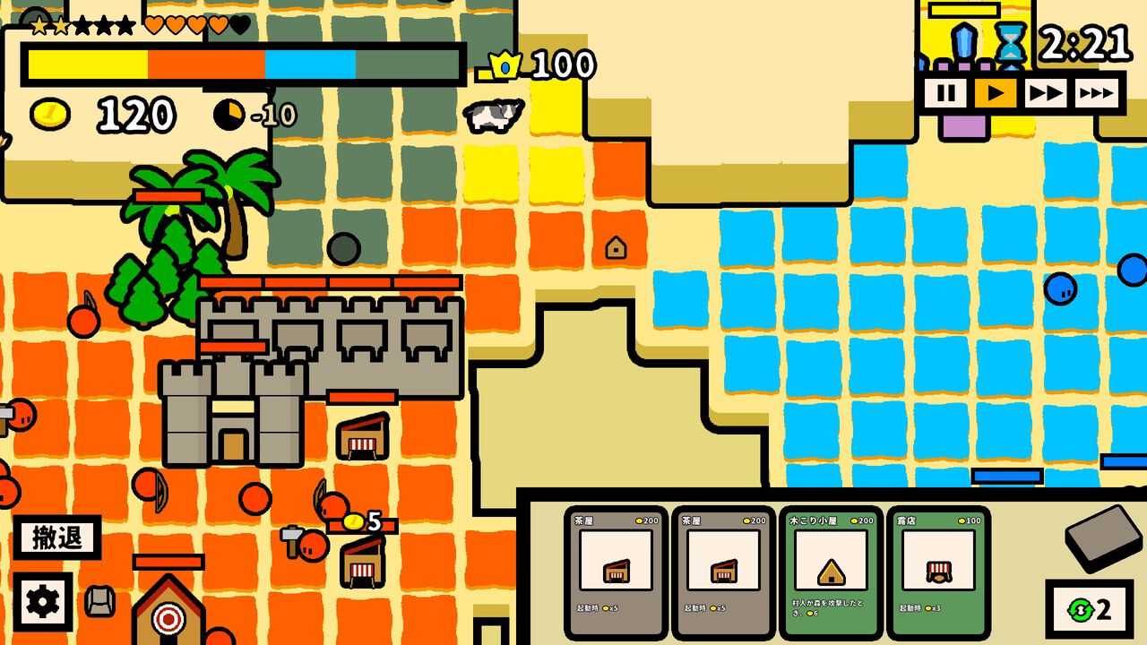 様々な建物を建設し、お金を稼ぎ、人口を増やして陣地を増やそう。