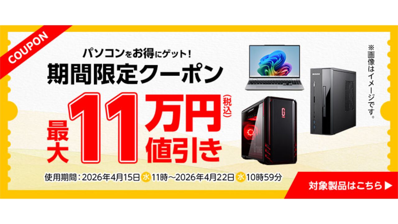マウスコンピューター公式ECサイトにてPCが最大110,000円オフで購入できるクーポンセールが2026年4月22日10:59までの期間で開催中。