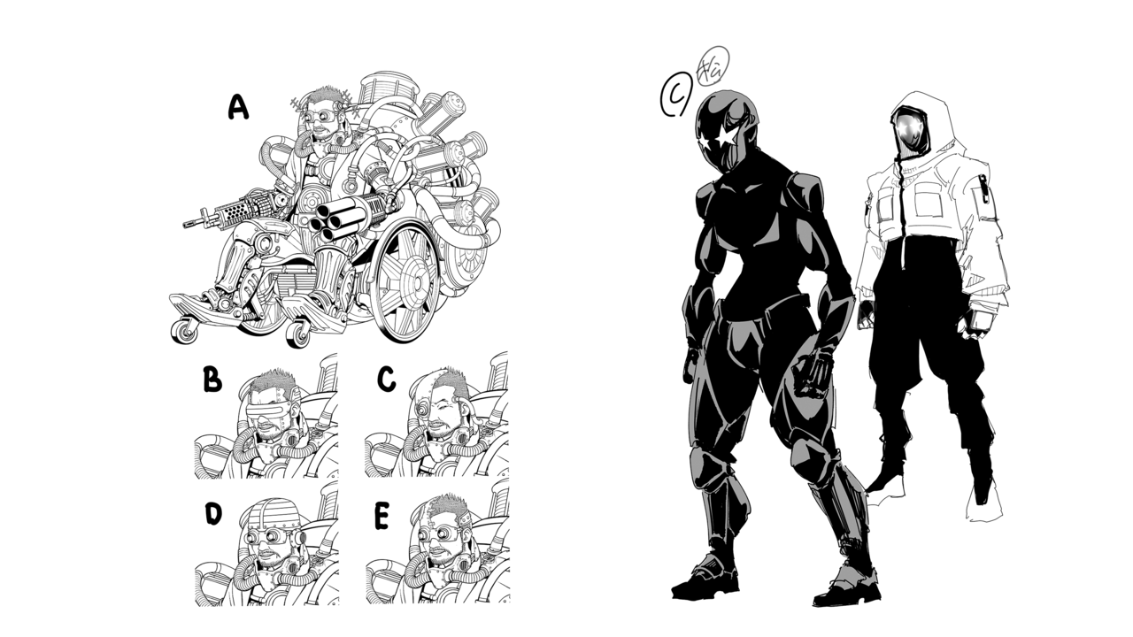 『T1』没案の宮崎さんは、元々はゲーム『戦場のフーガ3』の敵役ブルットヴルストの乗る車椅子を参考にデザインしました。そのためスチームパンク寄りのデザインで『戦場のフーガ3』中の設定に出て来る生体電池が刺さっています。