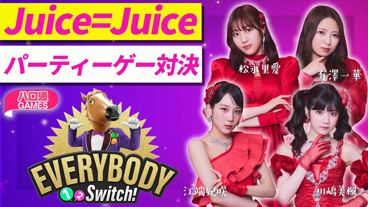 今回は、Juice=Juiceの松永里愛さん、有澤一華さん、江端妃咲さん、川嶋美楓さんがご出演。任天堂のパーティーゲーム『エブリバディ 1-2-Switch!』などのゲームをプレイします。本編終了後はファミ通チャンネルにておまけ配信を実施予定です。ご期待ください!