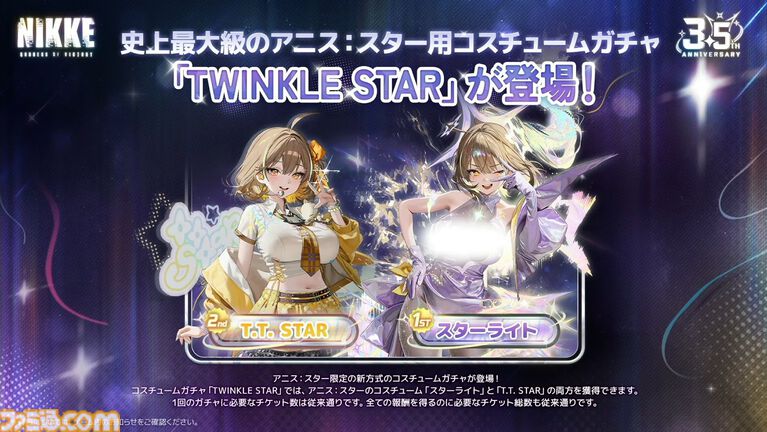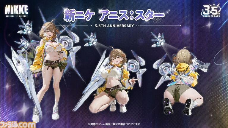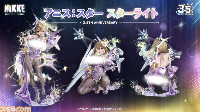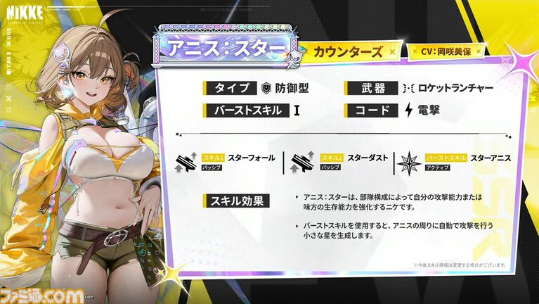 | スキル効果 | ・部隊構成によって自分の攻撃能力または味方の生存能力を強化するニケ。 ・バーストスキルを使用すると、アニスの周りに自動で攻撃を行う小さな星を生成する。 |
