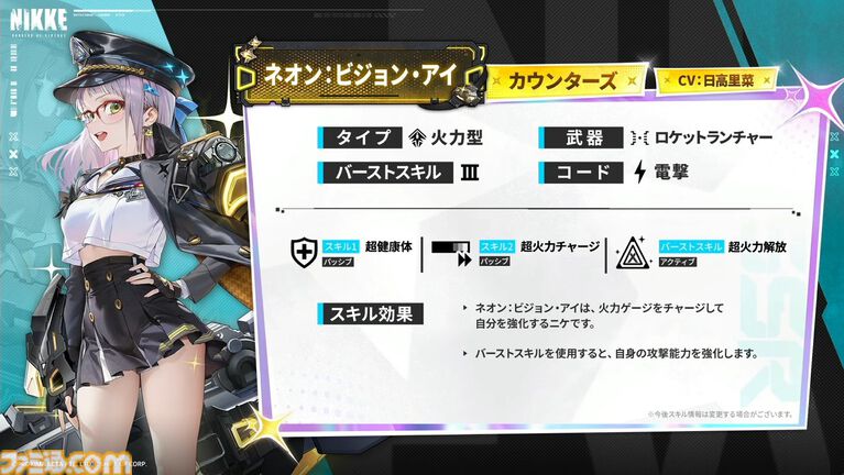| スキル効果 | ・火力ゲージをチャージして自分を強化するニケ。 ・バーストスキルを使用すると自身の攻撃能力を強化する。 |