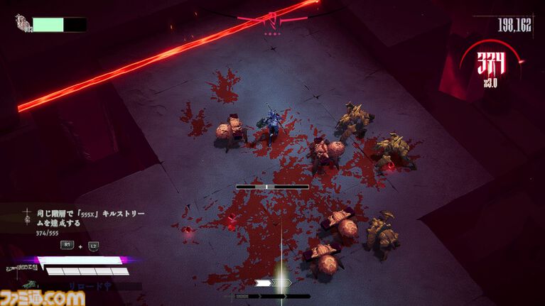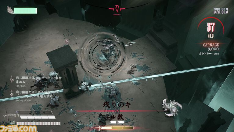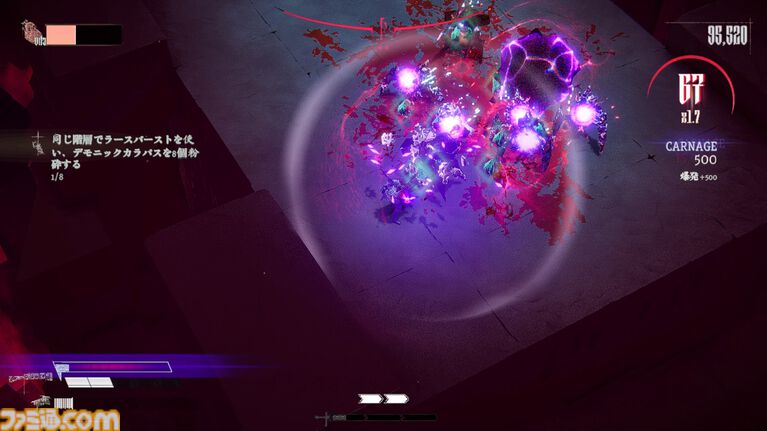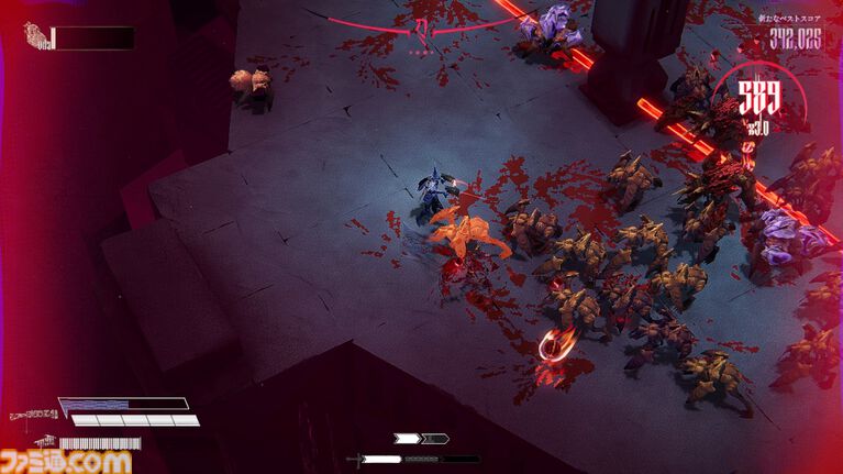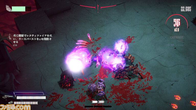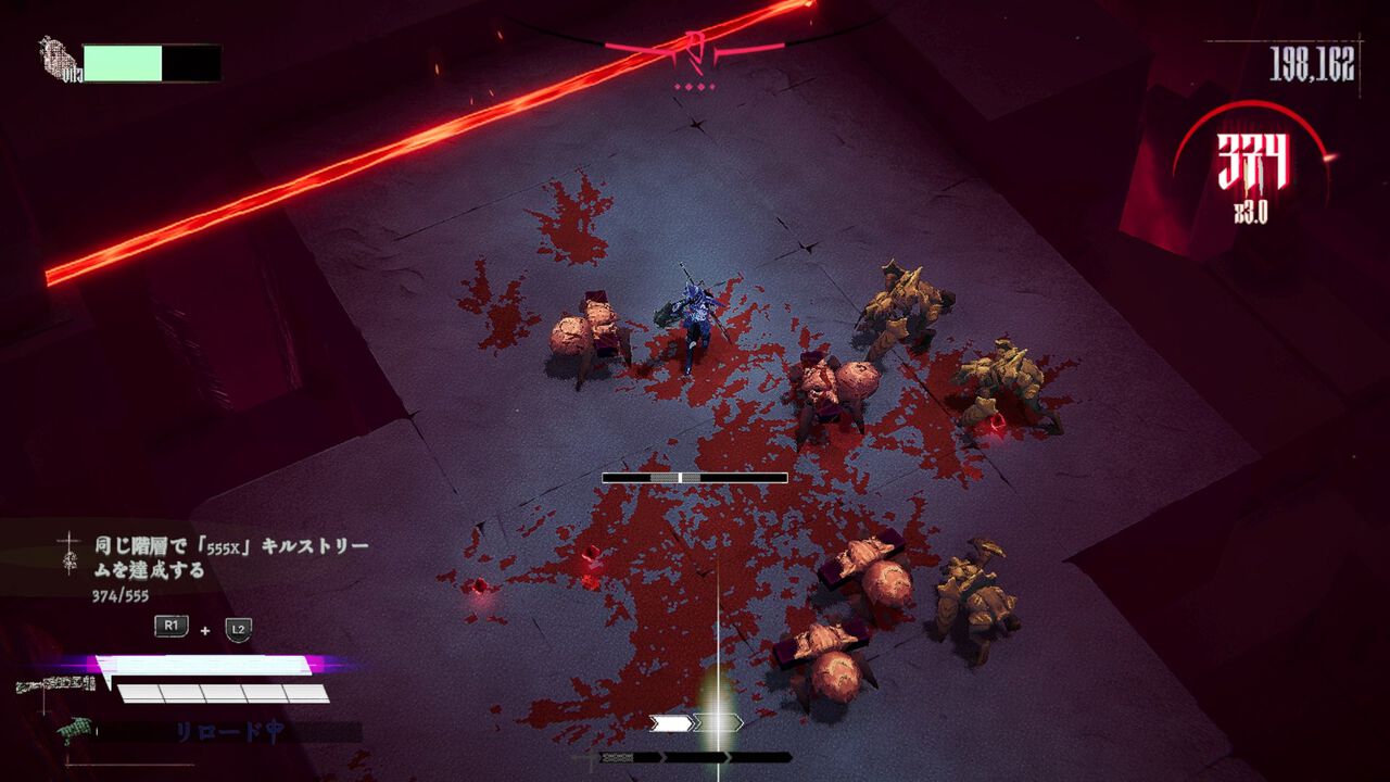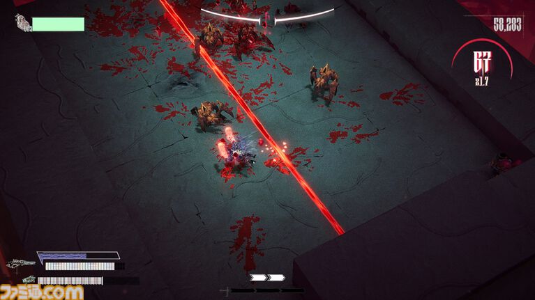 倒した敵から落ちるブラッドジェムを獲得すると自身の攻撃がより強力に。敵の血を浴び、強くなるのだ。