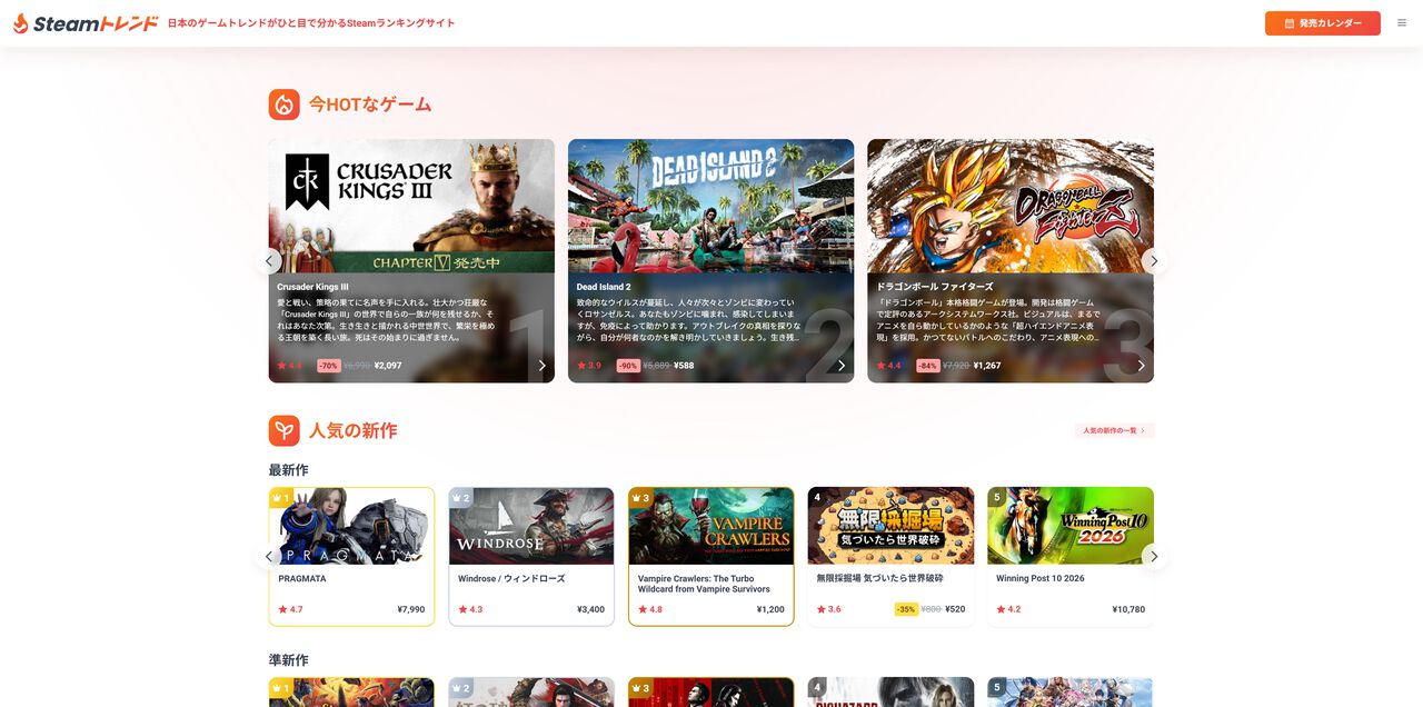 Steamの各種データを独自分析し、「今、日本でHOTなゲーム」TOP5をランキング化。他にも「ジャンル別トレンド」「人気の新作」「ウィッシュリスト上位」「セール中」など全19のカテゴリで、Steam上の流行を余すところなくピックアップします。