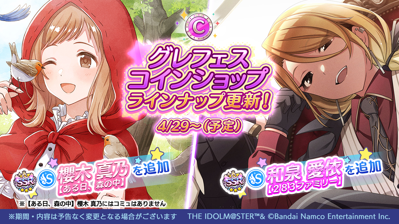 グレフェスコインショップではSSRサポートアイドル【ある日、森の中】櫻木 真乃、【283ファミリー】和泉 愛依を追加!