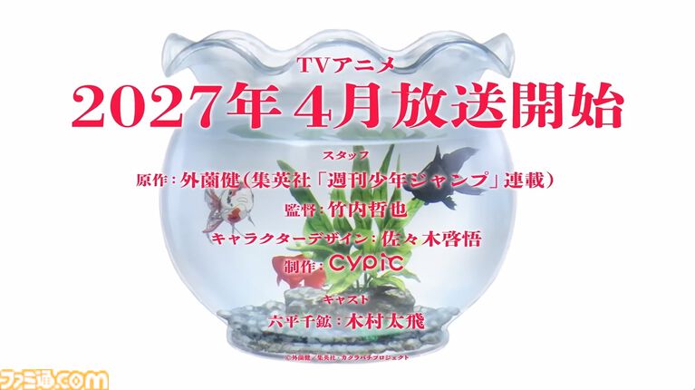 この度、アニメーションスタジオ・Cypic(サイピク)制作でTVアニメ化が決定し、2027年4月に放送開始することが発表された。合わせてティザービジュアルとティザーPVが解禁。原作者の外薗健からお祝いイラストとコメント、監督の竹内哲也、キャラクターデザインの佐々木啓悟、六平千鉱役の木村太飛からもコメントが到着した。さらに、第1話冒頭20分を上映するワールドツアーの開催が決定し、ツアーファイナルは日本で超大ボリュームの第1話全編を世界最速でお披露目することも決定した。