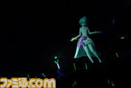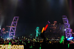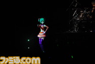 DIVA desu.』がスタートすると一斉に緑色のサイリウムが輝きを放ち、会場の熱気が一気に上がった。1曲目が終了後、ステージ上の巨大スクリーンに初音ミクが登場。軽快なダンスで『ワールドイズマイン』、『サウンド』、『恋するVOC@LOID』などを歌い上げたほか、メドレーではマジシャン、にゃんこ、チャイナなど、つぎつぎとモジュール(コスチューム)をチェンジさせるといった初音ミクならではの演出も!『from