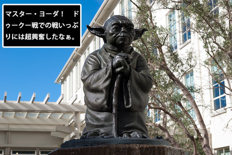 腹を満たしたっつーことで、地価がクソ高いサンフランシスコの中でも特に高級住宅地であるプレシディオにある、レターマンデジタルアーツセンターという施設へ移動。ここにはスター・ウォーズの生みの親であるジョージ・ルーカスが設立した、特殊効果やVFXの専用スタジオであるILMが入っているのだ(旧ルーカス・アーツもココにあった)。