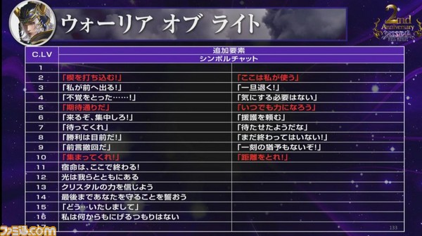 なお、キャラクターレベルを上げることで、新たなシンボルチャットも開放されるほか、既存のレベルにも新たなシンボルチャットが追加される。今回公開されたのはウォーリア オブ ライトのものだったが、全キャラクターに追加されるそうだ。なお、レベル25で開放される特典は、1月のアップデートに追加を予定している(鯨岡D曰く、新HP攻撃ではないとのこと)。