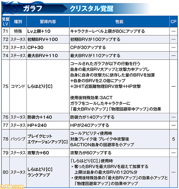 “しらはどり【C】”は、近距離物理BRV攻撃+HP攻撃を放つコールアビリティ。使用後の特殊効果でガラフをコールしたキャラクターに最大BRV20%アップと物理回避率100%アップを発生させる。絶対に避けたい敵の物理攻撃のタイミングを見てコールしよう。
