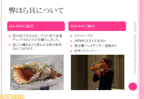 ▲“ほら貝演奏のご提案”と題したプレゼン資料を持って説明に回るつもりだったのだが。 |