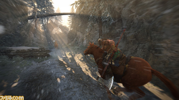 さて、順調に進みラグナルのいる建物まで来たレイダー。中に入るとラグナルが待ち構えており、「ボスどうしタイマンで勝負して決着をつけよう」と言わんばかりに、群衆が群がっている。レイダー対レイダーの勝負だが、落ち着いて相手の出方を見て、攻撃が当たる直前にR2を押してパリィをとれば比較的簡単に倒せるだろう。「ラグナルも大したことないな」なんて少し油断していた筆者だったが、トドメを刺そうとしたところで、カットシーンへ。ラグナルは馬に乗って逃走するので、こちらも馬に乗って追い駆ける“騎馬戦”にもつれ込むのだ。
