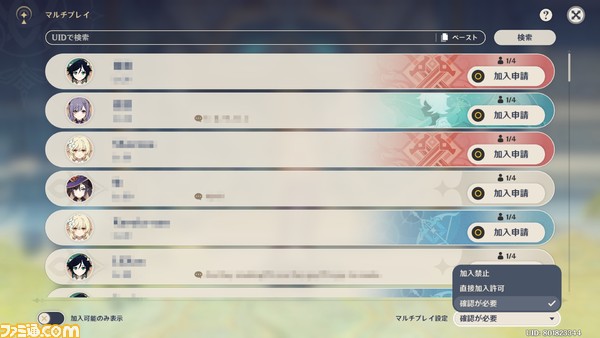 参加したいプレイヤーのUIDを検索するまたはリストに表示されるプレイヤーを選んで“加入申請”を行う。