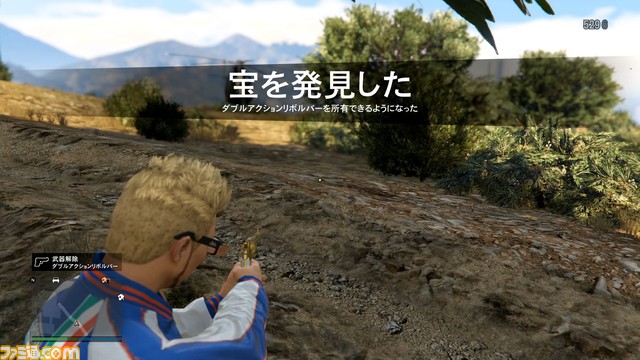 そうこうしていると、ゲーム内スマホのメールに謎の写真が送られてきました。これは“トレジャーハント”というミニクエストのようで、写真と似た場所を探し出し、さらに表示される3つの場所から手掛かりを探し出せれば『レッド・デッド・リデンプション2』のコラボ武器“ダブルアクションリボルバー”が手に入るというものでした。どうしても欲しかったのと、お金稼ぎで目が血走っていたので、落ち着かせるためにもちょっと寄り道します。