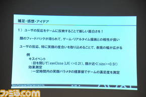 自分の顔の動きがゲーム内に反映される顔認識技術。セッションはアイデアの一例として、キスイベントなどで使ってもおもしろいのでは、というユニークな提案も。新しいプレイ感覚だけではなく、アイデア次第ではいままでにないゲーム体験をも味わせてくれそうだ。
