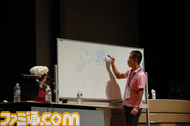 ▲たとえば、パンチを繰り出すときは、あたった瞬間を描いて痛さを表現するときもあれば、わざとあたったときの表現を省いてスピード感を出すときもあるという。橋本氏の説明にあわせて、お茶目な表現の岩出氏が◎。 |