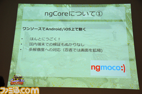 つぎに『忍者ロワイヤル』の開発にも活用されているエンジン“ngCore”について触れ、実際に使ってみた感想を「よく“どうなの?”という声を聞きますが……まぁふつうに使えます(笑)」と佐藤氏。“本当にワンソースでiOSもAndroidも動くのですごい”、“国内端末での検証も抜かりなし”、“多解像度に対応”とその利点を挙げた。そのほか、アプリの容量の軽量化を図る際に、佐藤氏が実際に使っているというオススメツールもいくつか紹介されたり、「電車でつり革に掴まりながら遊びたいから縦持ちの画面にしたい」、「(ngCore専用の統合開発環境)ngBuilderを使いたい(※『忍者ロワイヤル』は同環境が整っていないときに開発されたものだから)」など、エンジニアとして今後『忍者ロワイヤル』で改善していきたいことを語っていた。