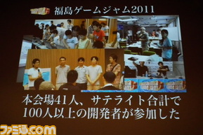 また直接貢献として、南相馬市で行われた福島GameJamを共催したことも紹介された。これは、東京や東北各県からゲーム開発者が集い、30時間でゲームを作るというもの。南相馬の子供が描いた絵を使ったり、テスターとして参加してもらったりといった取り組みも行われている。最後は、これからも“いまできること”をやっていきたいとの決意で締めくくられた。