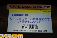 2011年9月15日より開催されている東京ゲームショウ2011。初日に行われたTGSフォーラム2011に、“GREE”を運営するグリーの田中良和社長が登壇。“ソーシャルゲームが巻き起こすパラダイムシフト”と題した基調講演が行われた。