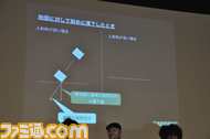 映像を見ながら、流れる音の尺を合わせたあと、「これだけでは芸がないので、音を上に展開させていきましょう。コードのオクターブを上げることで、音が上に広がっていくわけですね」と音の幅を広げていく。それを聴いてみると「なんかすごいオシャレになった」(山東氏)。その後、北川氏は「このパートは置いておいて、音を足しましょう。映像を見て思ったのは、みずみずしさに加えて、玉が表現されているので、コロコロした雰囲気を出したい」と新たな音を探しだしていく。「これがコロコロした感じ」と北川氏が語る音で、その前に作られた水っぽい音と同じコードをコピーして鳴らしてみると、「コロコロ感出てる。でも、コロコロ感が強すぎるかな。コロコロは主役ではないので、バランスを取っていきましょう」(北川氏)。その後も、「さらに、迫力が欲しい。迫力と言えば、低音」と低音を足し、「迫力が出たけど、ちょっとくどいかな」と低音を徐々にフェードアウトさせ、「ロゴが飛び出しているところにインパクトが欲しい。シュワンっていうイメージの」とブラッシュアップを重ね、ロゴの飛び出るアニメーションと“シュワンっていうイメージの音”のタイミングがバッチリ合うと、観客からは「おおー」というどよめきが起こっていた。これらの過程を経て、短時間にジングルは完成。「時間がないから、やりたいことの中でも時間がかかるものは排除して、できることを優先してやった」という北川氏の言葉に、岡田氏も「ゲーム制作も納期が非常に大事ですから、ある程度で見切りをつける必要があるんですね」と、今回の作業がいかに実作業に近かったかを補足して話していた。なお、講演で作られたものとは違うが、カプコンのニンテンドー3DS用ソフトを起動すると、カプコンサウンドが手掛けたジングルが確認できるので、ぜひ起動してみてほしい。
