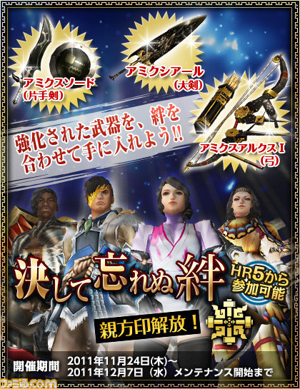 ゲーム内イベント“決して忘れぬ絆”では、クエストをクリアーすることで、イベントオリジナル武器“アミクスアールクスI”(弓)、“アミクスソード”(片手剣)、“アミクシアール”(大剣)の生産素材と、親方印への強化素材が入手可能だ。実施は12月7日までとなっている。