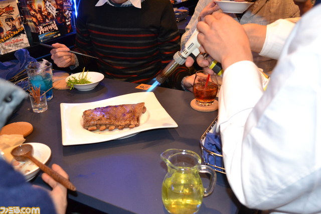 どのメニューも見た目のインパクトはもちろん味もバツグンで、大満足の仕上がりなのだが、記者のオススメは、『バイオハザード』シリーズの“生物の究極形!! タイラントのスペアリブ~暴君ソース~”。スペアリブの大きさにも驚きなのだが、目の前でスタッフがガスバーナーを使ってこんがりと焼き目をつけてくれるというパフォーマンスがあり、思わず「おぉ~!」と声で挙がってしまった。