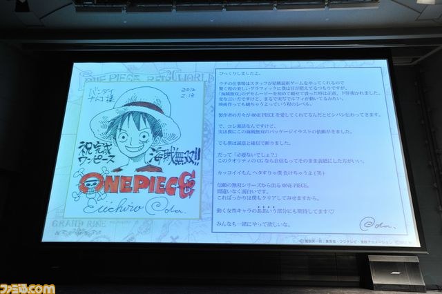 週刊少年ジャンプ編集長の瓶子氏は、『ONE PIECE(ワンピース)』の作者である尾田栄一郎氏からのメッセージを紹介。尾田氏はメッセージの中で「まるで、実写でルフィが動いているみたい」とグラフィックの仕上がりを絶賛するとともに、パッケージイラストの作成依頼を受けたものの、CGのキャラクターたちの完成度の高さを見て「誠意と確信でお断りした」というエピソードを披露した。