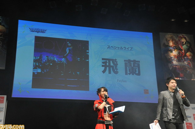 新作発表のあと、家庭用『ブレイブルー コンティニュアムシフトエクステンド』のオープニングテーマを歌うアーティスト飛蘭(フェイラン)さんのミニライブが行われた。「今日はみなさんを応援にきました」とのコメントどおりの力強い歌声で『蒼穹の光』と『Dead END』の2曲を披露し、会場を大いに盛り上げていた。