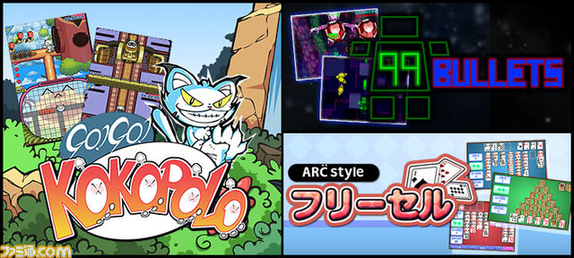 アークシステムワークスから、ニンテンドー3DSダウンロードソフト『ARC STYLE: フリーセル』と、ニンテンドーDSiウェアソフト『ゴー!ゴー!ココポロ!』、『99BULLETS』の3タイトルが、本日2012年5月30日より配信開始となった。以下、概要をリリースより抜粋する。