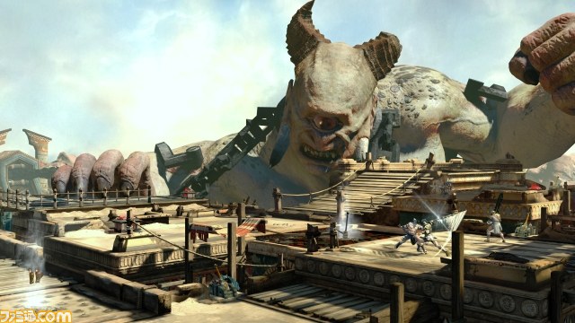 カンファレンス内では実機プレイデモが披露。デモ中では、おなじみの主人公クレイトスが、ブレイズ・オブ・カオスを始め複数の武器を使いながら敵を蹴散らしたり、シリーズ伝統の“CSアタック”(画面で指示されたボタンを素早く押すことでアクションを成功させる)を使って敵を倒す様子が見て取れたほか、巨大なクラーケンのような敵と戦うシーンも。また、クレイトスが緑色の光を発すると、壊れていたオブジェクトが、まるで時間が巻戻ったかのように修復されていき、それによって道が開ける……という場面も確認することができた。