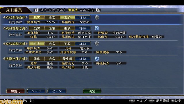 AIカスタマイズ画面です。軍事や内政など様々な設定ができます。編集したAIデータは、ネットワークを介してフレンドや他のユーザーと交換することができます(※新規要素)。